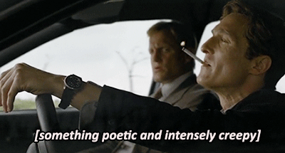 This isn’t your usual cheap, rushed TV show. Real effort has been made to make True Detective look, sound, and feel like a product that a lot has been put into. From the excellent cast to the wonderful cinematography and score this is a quality production through and through. Take for example the end of episode four which has one continuous shot that lasts for minutes and is truly jaw-dropping. This is the kind of aspect that elevates the show above it’s peers. I’m looking at you Two and a Half Men ( a show that could be improved instantly with some ritualistic murder).